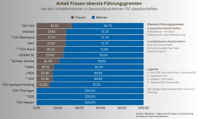 #TICinZahlen ist unsere LinkedIn-Serie zu Zahlen, Daten und Fakten der TIC-Branche (Testing, Inspection, Certification). Im März 2025 - pünktlich zum Internationalen Frauentag - haben wir uns näher angesehen, wie hoch der Frauenanteil an der Belegschaft und in Führungspositionen in den 14 bekanntesten in Deutschland tätigen Prüfdienstleistungsunternehmen ist. Kein leichtes Unterfangen.