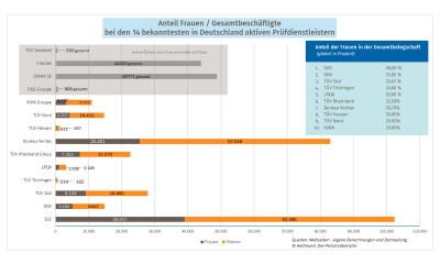 Daten zum Frauenanteil an der Zahl der Gesamtbeschäftigten waren denn auch nicht Anhieb zu finden. Uns überraschte, dass sogar so bekannte Unternehmen, wie DEKRA, DQS und Intertek keine Angaben zum Anteil der Frauen an der Beschäftigtenzahl veröffentlichen. Einzelne Prüfdienstleister geben mittlerweile Zielwerte für den Frauenanteil in der Belegschaft in Höhe von 30 % an (KIWA). Für die Auswertung waren nur globale Daten verfügbar (Deutschland konnte nicht einzeln betrachtet werden). Sie sehen also den Frauenanteil an der Gesamtbelegschaft (global).