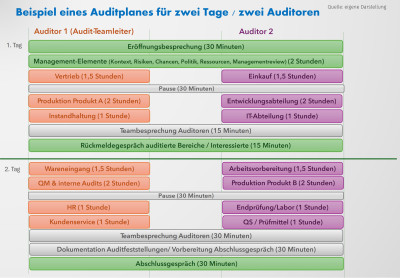 Daraus folgt, dass der Leitende Auditor für die Planung - je nach Komplexität und „Scopes“ der Auditoren - einen höheren Koordinationsaufwand hat im Vergleich zur alleinigen Durchführung. Im Auditplan müssen daher angemessene Zeitfenster geplant werden: