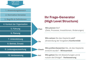 Für das Auditieren von Managementsystemen können sich Auditoren mit Werkzeugen helfen, die sich aus der sogenannten High Level Structure ergeben. Es gibt 10 Abschnitte, nach der jede Managementsystem-Norm gegliedert/strukturiert ist. Für Audits relevant sind hier die Kapitel 4 bis 10, die in der Logik des Management- (Qualitäts-) Regelkreises angeordnet sind (PDCA- Zyklus). Den einzelnen Phasen des PDCA-Zyklus sind Normenabschnitte zugeordnet, die man strukturell mit je einer Leitfrage erfassen kann. Die Grafik soll Ihnen helfen und als Fragegenerator dienen.