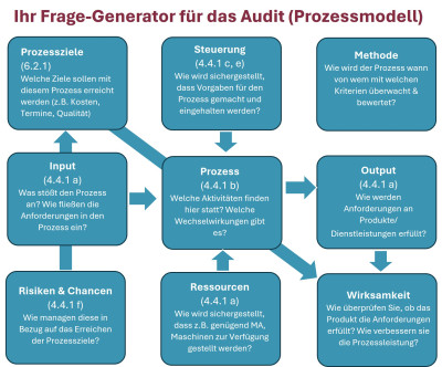 Neben der Nutzung des PDCA Zyklus können Fragen aus dem sogenannten Prozessmodell generiert werden. Die Managementsystem-Standards basieren auf dem prozessorientierten Ansatz und enthalten im Abschnitt 4.4 dazugehörige Anforderungen. In der Konsequenz sind Audits für Managementsysteme mindestens Prozessaudits oder prozessorientierte Systemaudits. In beiden Fällen werden also Prozesse auditiert: Management-, Kern- und Unterstützungsprozesse. Die ISO 9001:2015 beschreibt im Abschnitt 4.4.1 die für die Prozesse benötigten Elemente, die bei der Festlegung (Planung) der Prozesse berücksichtigt werden müssen. Diese Elemente als Modell abgebildet, bieten eine gute Grundlage für Fragen, die Auditoren stellen können.