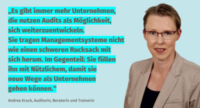 Andrea Kruck arbeitete viele Jahre als Trainerin, Beraterin und Coach. Neben Trainings zu ISO-Normen bildete sie 1st-, 2nd- und 3rd party-Auditoren aus und weiter. Sie kennt die Herausforderungen der Branche, die Anforderungen an den Beruf und die anstehenden Aufgaben. Die Bedeutung von Soft Skills werde jedoch in der Ausbildung und bei der Auswahl von Auditoren oft nicht ausreichend berücksichtigt.